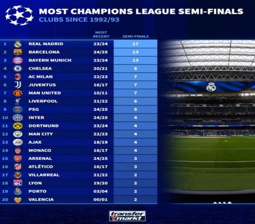 德轉(zhuǎn)列歐冠改制后進(jìn)入4強次數(shù)榜:皇馬17次居首,巴薩、拜仁前三