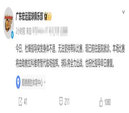 賽前廣東男籃官宣主教練杜鋒因突發(fā)腸胃不適,無(wú)法堅(jiān)持帶隊(duì)比賽,現(xiàn)已前往醫(yī)院就診,本場(chǎng)比賽由助教拉科維奇暫代臨場(chǎng)指揮。