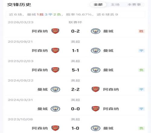 雖然不久前的聯(lián)賽杯決賽阿森納0-2不敵曼城,但槍手在英超對曼城已5場不敗(2勝3平),其中客場分別是0-0、2-2。