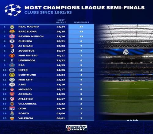 北京時間4月14日,德轉(zhuǎn)列出了自歐冠1992-93賽季改制以來,晉級歐冠半決賽次數(shù)最多的20支球隊,皇家馬德里以17次高居第一,巴塞羅那和拜仁慕尼黑13次并列第二。