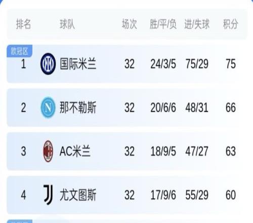 本輪意甲,國米4-3逆轉科莫,早些結束的那不勒斯1-1帕爾馬。最新積分榜,國米剩余6輪以9分優(yōu)勢領跑!