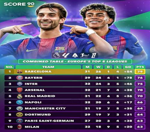 歐洲五大聯(lián)賽已經(jīng)進入最后沖刺階段,Score90統(tǒng)計了五大聯(lián)賽合并的積分榜,表格從左至右分別為比賽場數(shù)、勝、平、負、凈勝球以及積分。巴薩以79分位居第一,拜仁第二,國米第三,阿森納第四。