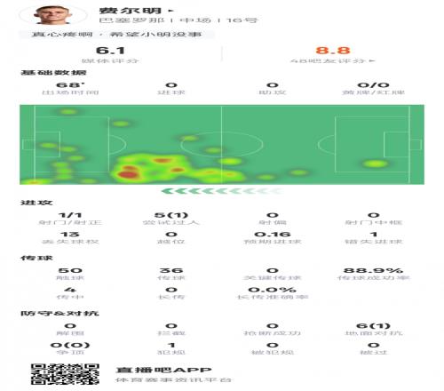 體育播報4月15日宣 歐冠1/4決賽次回合,巴薩客戰(zhàn)馬競。費爾明首發(fā)登場,在比賽中頭部撞到穆索腳上,血染賽場。本場比賽,費爾明1次射門1次射正,5次過人成1次成功,錯失1次進球機會,評分6.1。