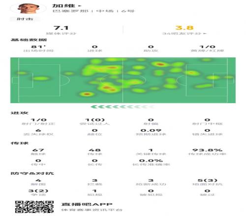 肘擊染黃!加維本場(chǎng)1犯規(guī)+4解圍3攔截3搶斷8對(duì)抗5成功+1關(guān)鍵傳球