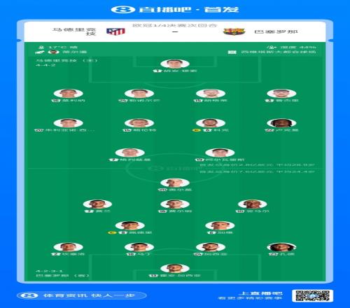 體育播報4月15日宣 歐冠1/4決賽次回合,巴塞羅那客戰(zhàn)馬德里競技,賽前雙方首發(fā)公布。首回合巴薩0-2馬競。