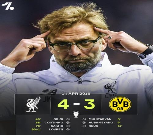 在雙方首回合較量中,利物浦客場(chǎng)1-1戰(zhàn)平多特,回到主場(chǎng)利物浦開局不佳,10分鐘過后就兩球落后,奧里吉在第48分鐘扳回一球,但是羅伊斯再度擴(kuò)大領(lǐng)先優(yōu)勢(shì)。隨后利物浦展開瘋狂反撲,第66分鐘、78分鐘分別由庫蒂尼奧和薩科破門扳平比分,最終在91分鐘由洛夫倫完成絕殺。