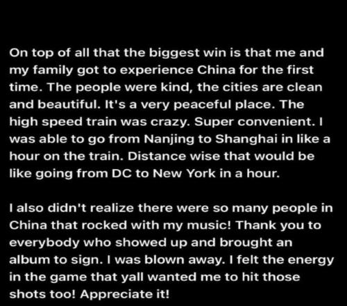 “我想感謝南京俱樂(lè)部和 CBA,讓我有這樣一段不可思議的經(jīng)歷。我也沒(méi)想到中國(guó)有這么多人喜歡我的音樂(lè)!謝謝所有到場(chǎng)支持、帶專輯來(lái)讓我簽名的人,真的讓我很震撼”
