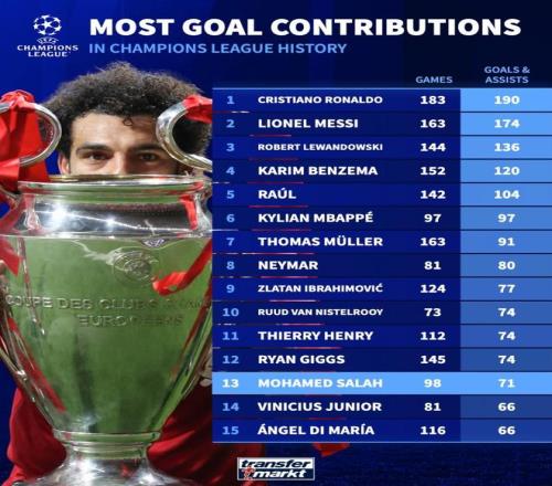 賽后德轉(zhuǎn)統(tǒng)計出了歐冠歷史直接參與進(jìn)球數(shù)的排行榜,薩拉赫以98場直接參與71球排名第13位。