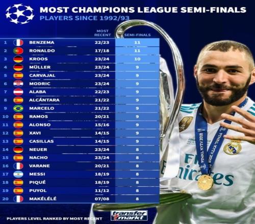 歐冠改制后參加半決賽次數(shù)榜:C羅、本澤馬11次最多,克羅斯10次