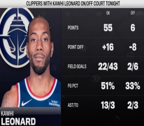 上半場,快船球星倫納德出場20分鐘11投5中,三分4中0、罰球4中4拿到14分6籃板3助攻。