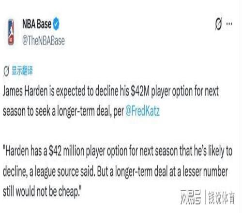 北京時(shí)間4月17日,知名體育媒體The Athletic(TA)援引聯(lián)盟消息人士消息爆料,哈登下賽季手握價(jià)值4200萬美元的球員選項(xiàng),從目前局勢(shì)來看,他大概率會(huì)選擇跳出合同。即便哈登后續(xù)簽下的新合同年薪有所降低,但憑借其賽場(chǎng)影響力,這份長(zhǎng)期合同的薪資總價(jià)依舊會(huì)處于聯(lián)盟頂尖水準(zhǔn),數(shù)額十分可觀。
