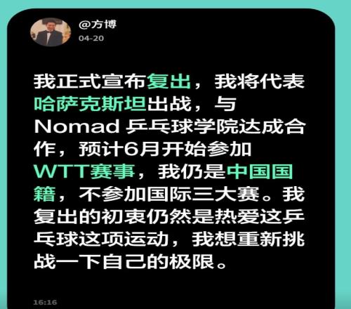方博發(fā)文回應:“我正式宣布復出,我將代表哈薩克斯坦出戰(zhàn),與Nomad乒乓球學院達成合作,預計6月開始參加WTT賽事,我仍是中國國籍,不參加國際三大賽。我復出的初衷仍然是熱愛這乒乓球這項運動,我想重新挑戰(zhàn)一下自己的極限?!?/p>