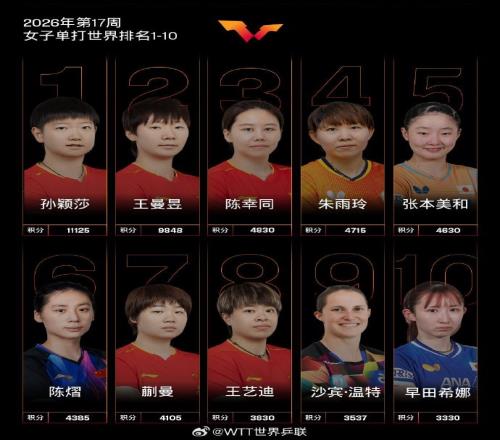 女單世界前10:1孫穎莎、2王曼昱、3陳幸同、4朱雨玲、5張本美和、6陳熠、7蒯曼、8王藝迪、9溫特、10早田希娜。