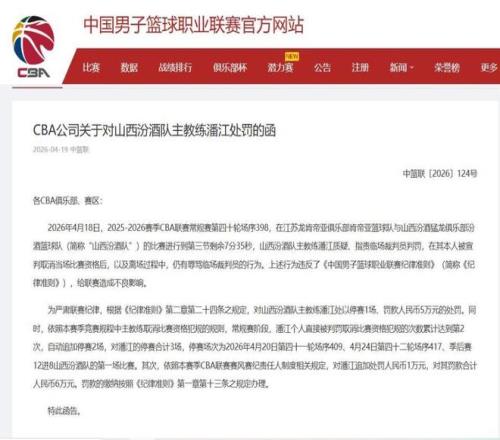 本賽季至今山西隊(duì)的戰(zhàn)績(jī)20勝20負(fù),排名常規(guī)賽第10,和上個(gè)賽季相比差距很大。近期山西隊(duì)主教練潘江因?yàn)樵诒荣愔腥枇R裁判遭籃協(xié)和CBA公司重罰,根據(jù)CBA公司官網(wǎng)的公示,潘江指導(dǎo)被禁賽3場(chǎng),罰款總計(jì)6萬(wàn)元,他不僅會(huì)缺席常規(guī)賽最后兩場(chǎng)比賽,季后賽附加賽第一場(chǎng)同樣無(wú)法出場(chǎng)指揮比賽,這次判罰還是非常嚴(yán)厲的。