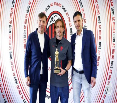在AC米蘭俱樂部,前克羅地亞國腳、米蘭舊將達(dá)里奧-西米奇(圖中左一)向莫德里奇頒發(fā)了獎(jiǎng)杯。