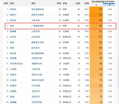 徐昕在離開杜鋒租借加盟廣州男籃后,打出了全明星級別的表現(xiàn)。本賽季徐昕場均出戰(zhàn)24.6分鐘,能夠得到11分8.4籃板1.9蓋帽,籃板本土第二,蓋帽則是本土第一。徐昕的出色表現(xiàn)在高階數(shù)據(jù)上也能體現(xiàn),在MVP的最重要的參考數(shù)據(jù)(累計獲勝貢獻(xiàn)水平)上,徐昕高達(dá)4.79,位列聯(lián)盟第四。