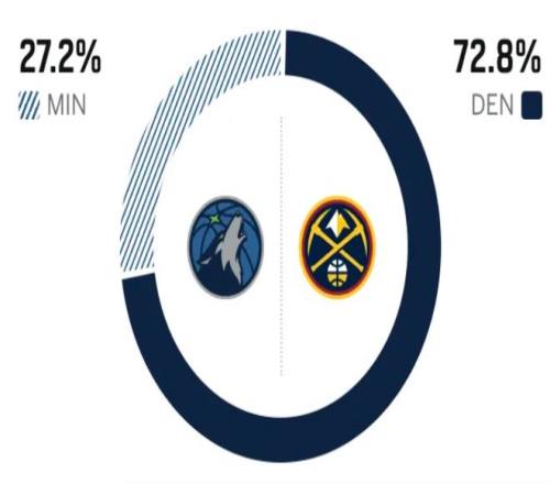 賽前,美媒ESPN對(duì)本場(chǎng)比賽進(jìn)行了勝率預(yù)測(cè),掘金隊(duì)勝率高達(dá)72.8% ,森林狼勝率則僅有27.2% ,差距更加明顯。