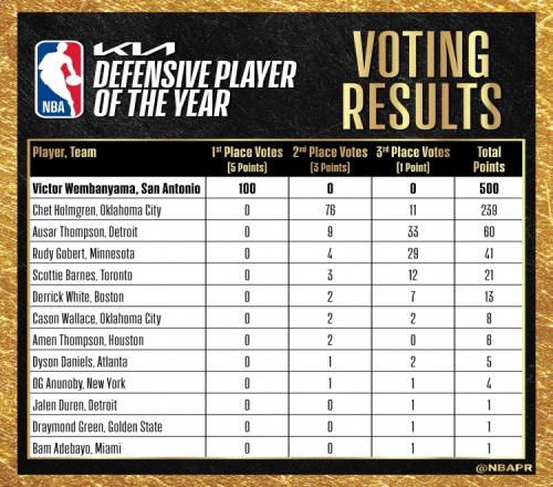 在隨后公布的投票詳情中,文班亞馬獲得全部100張第一選票,雷霆球星霍姆格倫拿到76張第二選票和11張第三選票,總分239分排名第二。