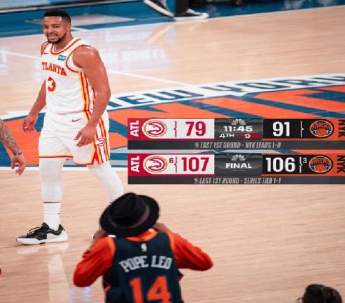 東部那邊同樣出現(xiàn)了以下克上情況,老鷹在客場(chǎng)107-106驚險(xiǎn)戰(zhàn)勝尼克斯,將系列賽打成1-1平局,兩隊(duì)重新站到同一起跑線上。