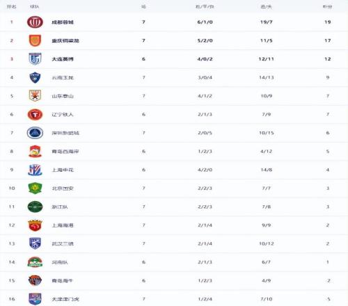 在積分榜上,成都蓉城依然排名榜首:6勝1平,拿到19分。大黑馬重慶銅梁龍5勝2平,保持不敗,拿到17分,排名第2。大連英博以12分排第3。云南玉昆9分,排名第4。山東泰山贏球之后,總積分達(dá)到7分,升到第5名。遼寧鐵人也是7分,排名第6。上海申花4分,排名第9。北京國(guó)安贏球之后,總積分達(dá)到3分,排名第10。上海海港依然是2分,排第12。