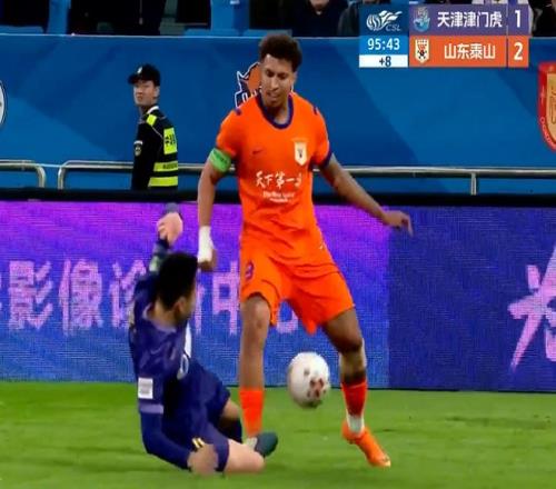 新周海濱!山東21歲新星爆射打入中超處子球,天津飛踹腿逃脫紅牌
