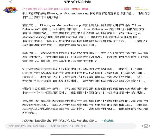 今天(4月21日)晚上,針對(duì)Bar?a Academy網(wǎng)站出現(xiàn)不當(dāng)圖片內(nèi)容,巴塞羅那足球俱樂部(昵稱“巴薩”)在其B站官方賬號(hào)動(dòng)態(tài)評(píng)論區(qū)中發(fā)文回應(yīng)。