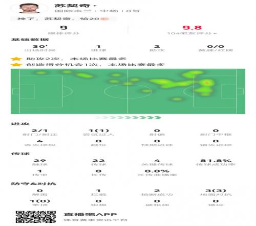 體育播報4月22日宣 國米在意大利杯半決賽次回合3-2逆轉(zhuǎn)科莫,蘇契奇本場數(shù)據(jù)如下: