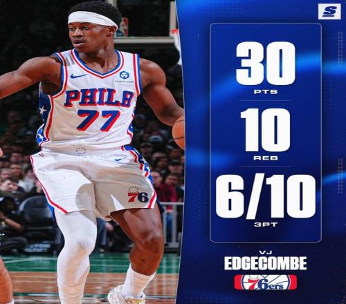 76人隊(duì)后場勇將VJ埃奇庫姆,在此役迎來了暴走。新秀埃奇庫姆登場35分鐘,投籃20中12,三分10中6,沒有罰球,怒砍30分10籃板2助攻2搶斷,正負(fù)值+17冠絕全場。埃奇庫姆以60%的超高命中率砍下了全隊(duì)的最高分,他還以60%的命中率投進(jìn)了全場最多的6記3分球。埃奇庫姆在上半場砍下了20分,次節(jié)獨(dú)得16分成為逆轉(zhuǎn)功臣。下半場再得10分的埃奇庫姆,延續(xù)了火熱的手感。