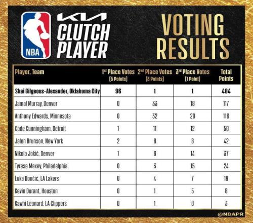唱票結(jié)果顯示,亞歷山大拿到了100張第一選票中的96張,最終以484分的總得分遙遙領(lǐng)先其余所有候選者。排名第二的是得到117分的賈馬爾·穆雷,第三是116分的愛德華茲。而剩余4張第一選票則被布朗森(2票)、坎寧安和約基奇獲得。