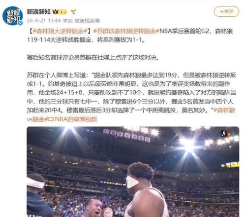 蘇群明確指出,掘金在領(lǐng)先19分情況下遭翻盤,約基奇的體能透支是無法回避的核心變量。