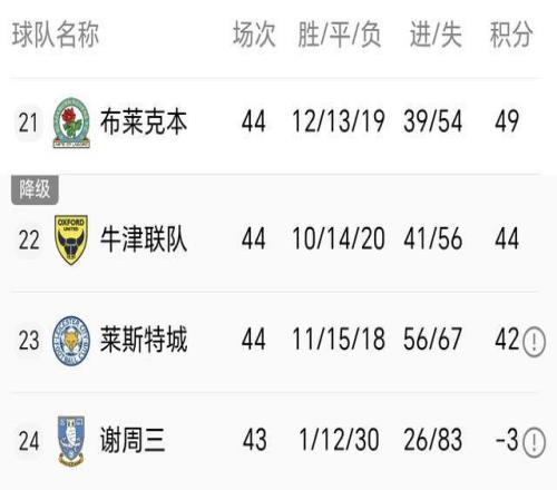 全場戰(zhàn)罷,萊斯特城主場2-2戰(zhàn)平赫爾城,遭遇聯(lián)賽7輪不勝,44輪比賽僅積42分,位列英冠第23也就是倒數(shù)第2,提前2輪降入英甲聯(lián)賽!