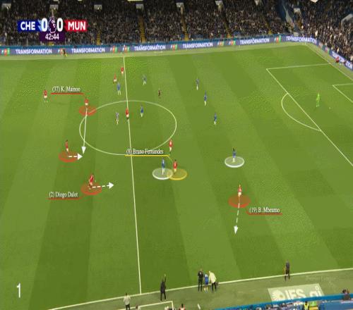 在3月15日老特拉福德3比1戰(zhàn)勝阿斯頓維拉的例子中,曼聯(lián)發(fā)動(dòng)反擊,費(fèi)爾南德斯與庫尼亞交換位置。