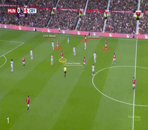 當(dāng)時(shí)曼聯(lián)沿右路推進(jìn),費(fèi)爾南德斯起初處于中路位置。當(dāng)達(dá)洛特將球分邊給卡塞米羅時(shí),費(fèi)爾南德斯立即沖刺,攻擊水晶宮左中衛(wèi)杰迪-康沃身后的空當(dāng)——后者正上前外擴(kuò)去防守姆伯莫。