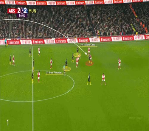費(fèi)爾南德斯控下球后,庫尼亞向內(nèi)沖刺,插入阿森納中場線與防線之間的區(qū)域。