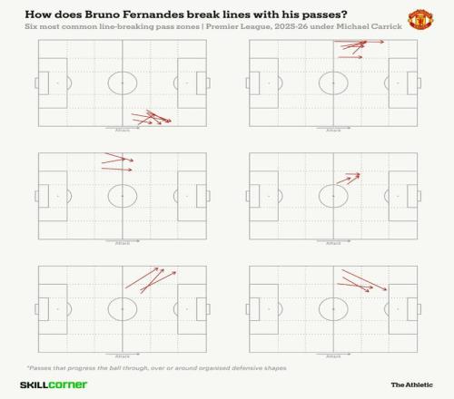 后者在他的最具穿透性傳球中尤為明顯——這類傳球被定義為能夠穿過、越過或繞過防守屏障來推進(jìn)皮球。利用SkillCorner的數(shù)據(jù)可見,在卡里克執(zhí)教下的英超比賽中,費(fèi)爾南德斯最常送出的兩記穿透性傳球分別發(fā)生在右翼和左翼。