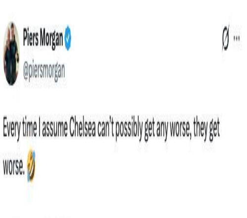 切爾西在英超第34輪客場(chǎng)0-3不敵布萊頓后,再次陷入輿論批評(píng)。英國電視主持人、阿森納球迷皮爾斯-摩根也在社交媒體上發(fā)文調(diào)侃藍(lán)軍。