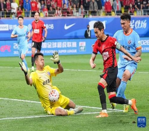 4月21日,云南玉昆隊守門員鮑亞雄(左)在比賽中撲救失敗。