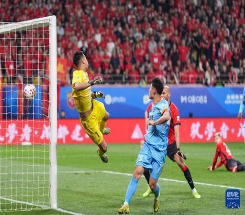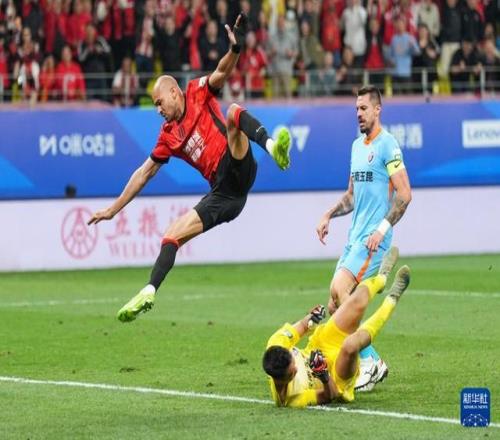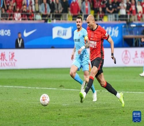 4月21日,成都蓉城隊球員費利佩(上)在比賽中射門得分。