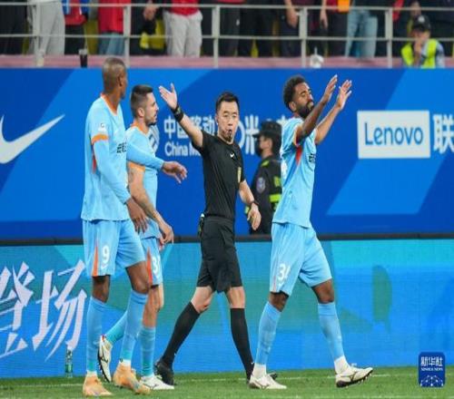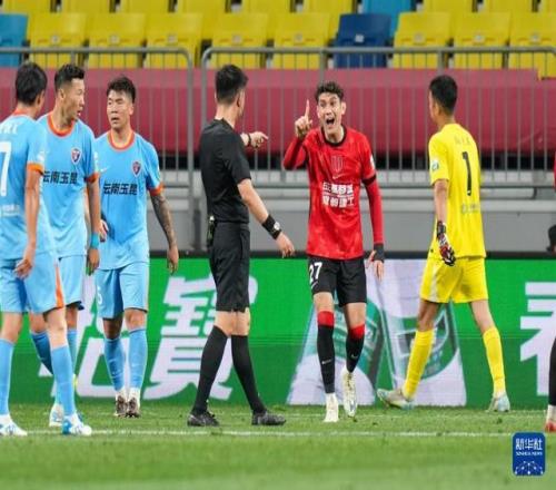 4月21日,主裁判戴弋戈(右二)在回看VAR(視頻助理裁判)后判罰云南玉昆隊進球無效。