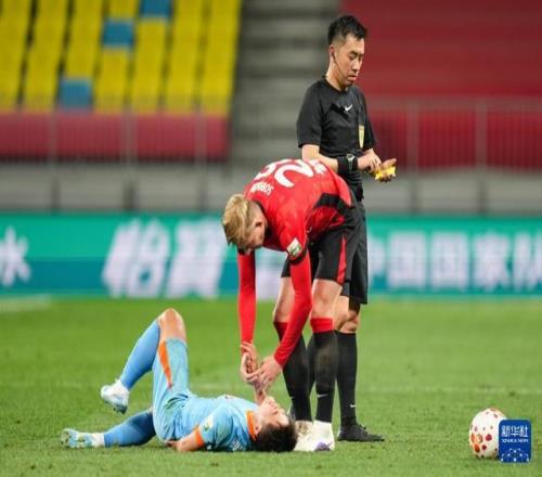 4月21日,主裁判戴弋戈(右)向成都蓉城隊球員索羅金(中)出示黃牌。