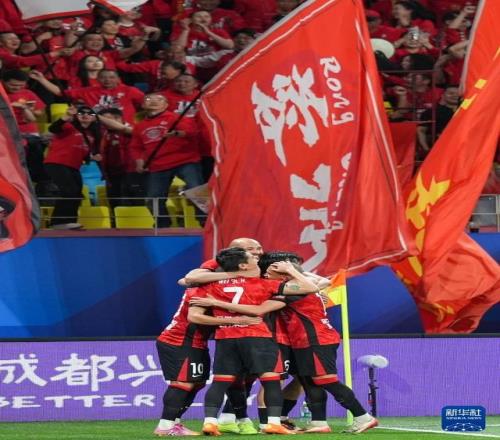 4月21日,成都蓉城隊球員在進球后慶祝。