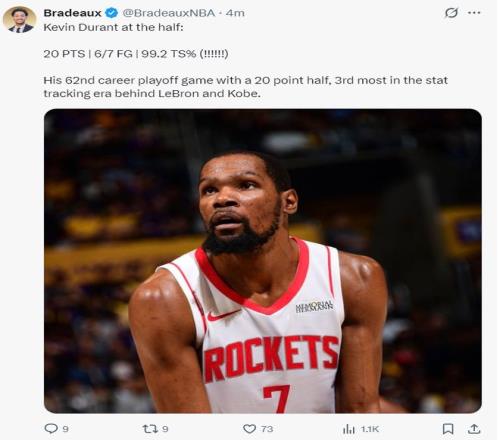 次節(jié)湖人一度拉開到15分了,杜蘭特登場時他的隊友們都已經開始低著頭沉默不語,KD只是淡定的進攻、防守,他連拿5分幫助全隊激勵士氣,火箭延續(xù)一波12-0打停湖人。暫停后KD中投造犯規(guī),杜蘭特第二節(jié)也拿到9分,上半場7中6+罰球7中7拿到20分3籃板1搶斷1蓋帽,命中率85.7%,火箭全隊半場才51分。(杜蘭特第62次半場季后賽20+歷史第三,僅次于詹姆斯/科比)