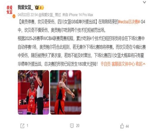 根據(jù)我愛(ài)女籃的報(bào)道,奧貢G5有可能會(huì)禁賽,坎貝奇受傷,四川女籃搶五或只有單外援出戰(zhàn)。四川女籃只剩下霍華德這個(gè)能力最差的外援,那么總決賽的形勢(shì)已經(jīng)發(fā)生了180度的大逆轉(zhuǎn)。