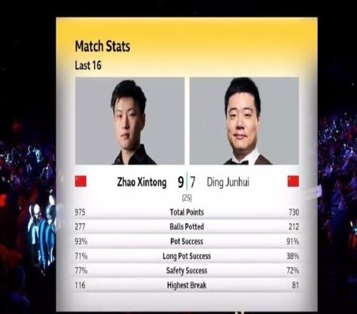 趙心童97丁俊暉數(shù)據(jù):總分975730、長臺71%38%、安全球77%72%
